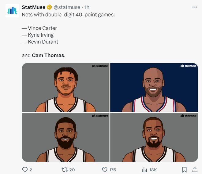 卡姆-托马斯又打出了一场奇葩的高分,全场比赛40分0助攻,作为篮网的先发二号位,他眼中只有篮筐,32分钟里狂出手25次命中11球,三分球12中5,命中率44%,三分命中率41.7%,罚球更是13中13。
