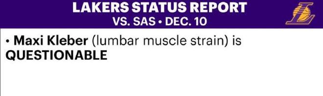 NBA杯1/4决赛正火热进行,12月11日湖人与马刺的对决会是焦点大战。如今两队的伤病报告出炉,湖人只有克勒贝尔一人出战成疑,斯马特将迎来复出,马刺则是文班亚马与3位下放发展联盟的双向球员合计4人缺席。