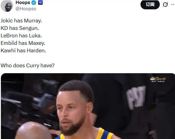 赛后,美国媒体Hoops为库里打抱不平,他们发文说:约基奇有默里,杜兰特有申京,詹姆斯有东契奇,恩比德有马克西,伦纳德有哈登,库里身边有谁?