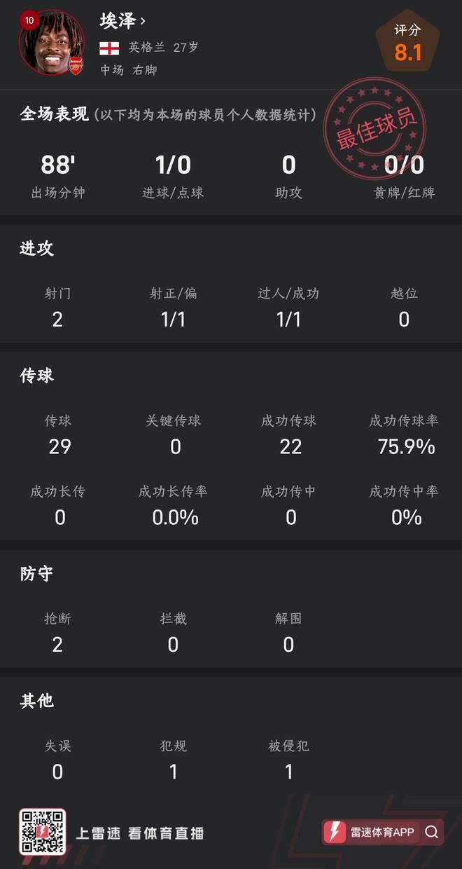 此役,埃泽首发出战88分钟,全场2次射门其中1次射正,1次尝试过人且成功。传球数据方面,埃泽全场29次传球,其中22次传球成功,传球成功率75.9%。防守端,埃泽全场完成2次抢断。此外,埃泽此役1次犯规且1次被侵犯。