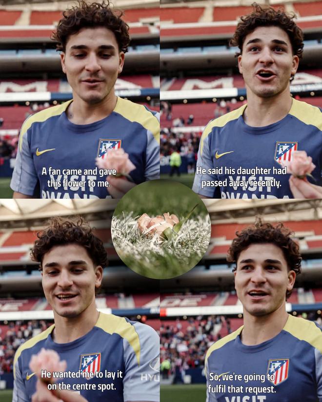 雷速体育10月27日讯 据TNT体育报道,马德里竞技前锋胡利安·阿尔瓦雷斯答应一位球迷的请求,在一场公开训练中将一朵鲜花送到了球场中央。