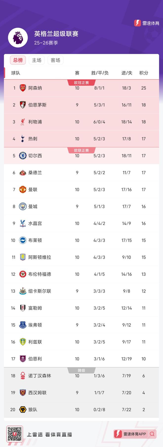 雷速体育11月2日讯 英超第10轮比赛已经7场战罢。最新积分榜方面,阿森纳8胜1平1负,目前以25分领跑。伯恩茅斯少赛一轮落后榜首7分,暂居次席。