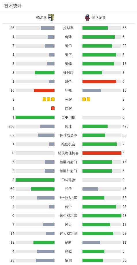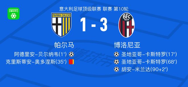 北京时间11月3日意大利足球顶级联赛 联赛 第10轮,帕尔马主场对阵博洛尼亚。帕尔马阿德里安-贝尔纳韦破门。博洛尼亚圣地亚哥-卡斯特罗梅开二度,胡安-米兰达破门。最终比分帕尔马 1-3 博洛尼亚。