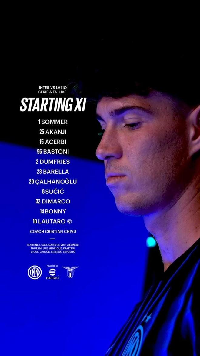 国米首发:1-索默、25-阿坎吉、15-阿切尔比、95-巴斯托尼、2-邓弗里斯、23-巴雷拉、20-恰尔汗奥卢、8-苏契奇、32-迪马尔科、14-博尼、10-劳塔罗