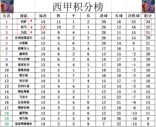 积分榜方面,巴萨今天逆转击败弱旅后,先赛的情况下超过皇马2分登顶成功,也是将压力甩给了皇马,他们若再不赢球,那就真的丢掉榜首了。马竞豪夺6连胜后,也是暂时超过比利亚雷亚尔2分,冲进前三,只落后皇马1分。