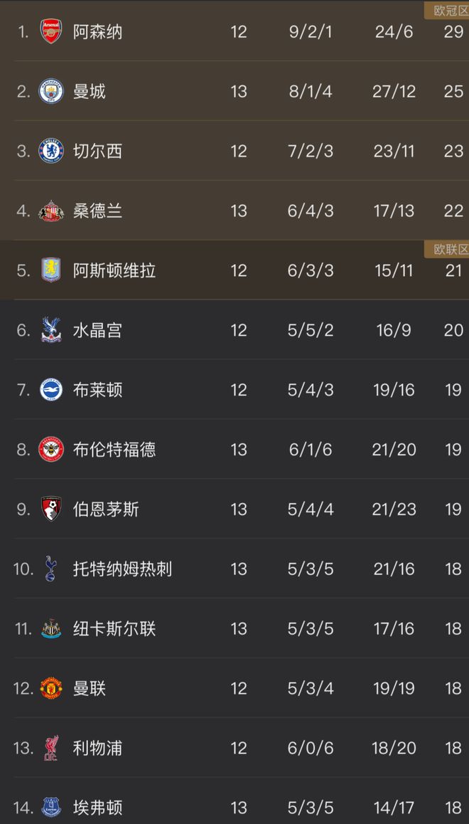 北京时间11月30日,英超第13轮先赛5场,而积分榜也因此再次发生巨大变化。